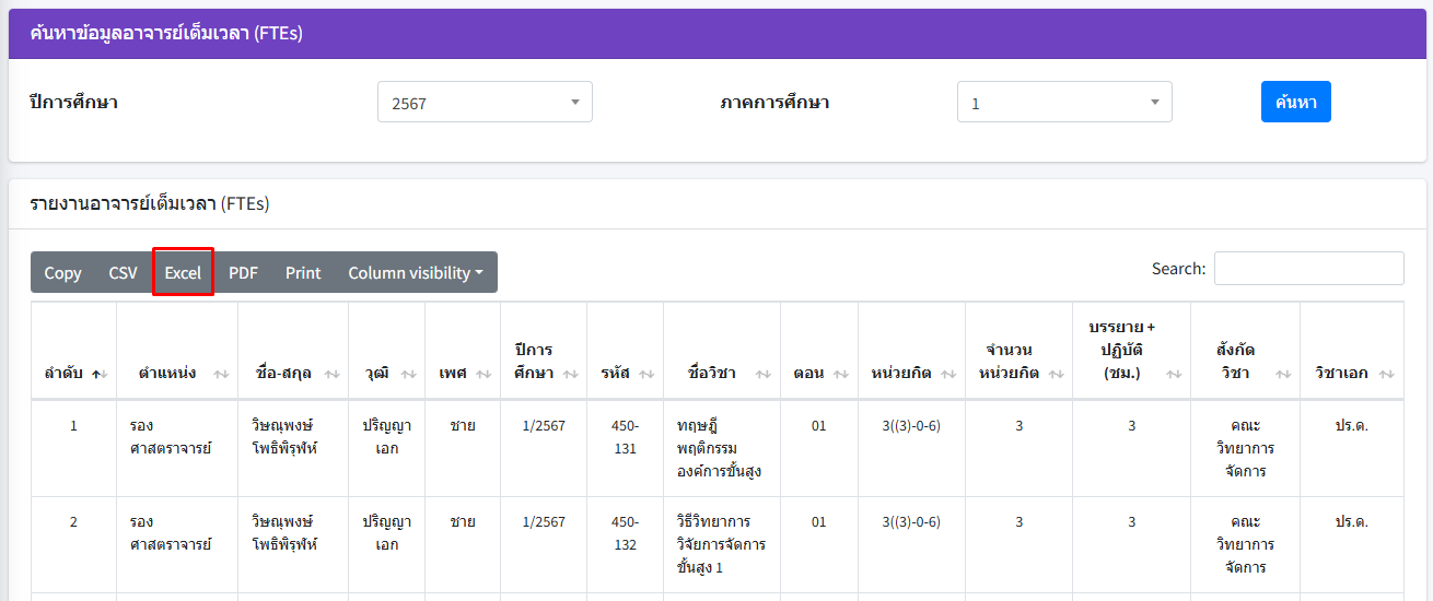- กดปุ่ม ค้นหา โดยระบบจะแสดงข้อมูลภาระงานสอนของอาจารย์ตามเงื่อนไขที่กำหนด
