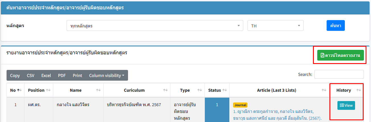 - กดปุ่ม ประวัติการเปลี่ยนแปลงรายชื่อ (ไอคอนสีฟ้า) ในคอลัมน์ History หากต้องการแสดงประวัติการเปลี่ยนแปลงรายชื่ออาจารย์ประจำหลักสูตร/ผู้รับผิดชอบหลักสูตร