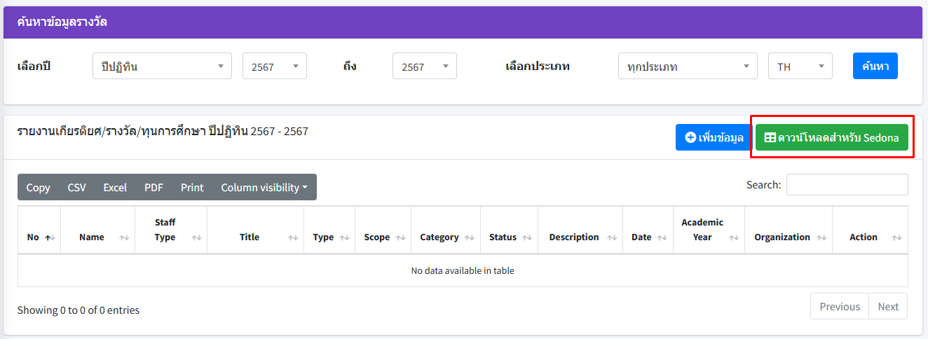 - กดปุ่ม ดาวน์โหลดข้อมูลสำหรับ Sedona เพื่อส่งออกไฟล์สำหรับนำเข้าระบบ Sedona