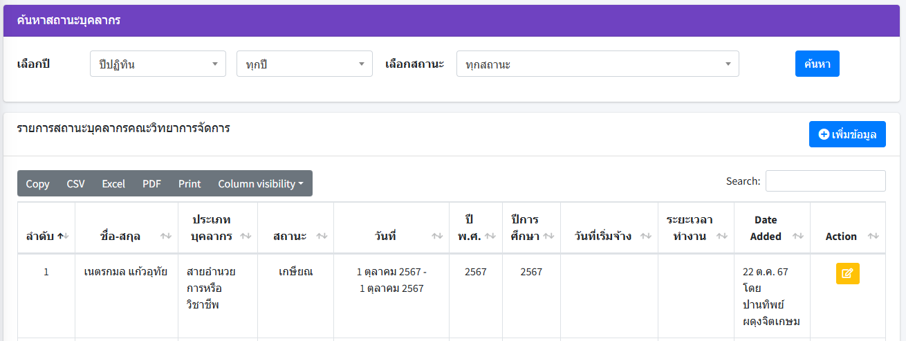 - ตั้งค่าการค้นหาข้อมูลสถานะบุคลากร ได้แก่ ประเภทปี (ปีฏิทิน ปีการศึกษา ปีงบประมาณ) ปีที่ค้นหาข้อมูล และสถานะ