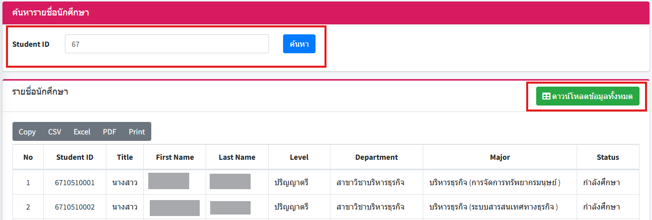 - กดปุ่ม ดาวน์โหลดข้อมูลทั้งหมด หากต้องการดาวน์โหลดข้อมูลรายชื่อนักศึกษาตามเงื่อนไขการค้นหาข้อมูลที่กำหนด