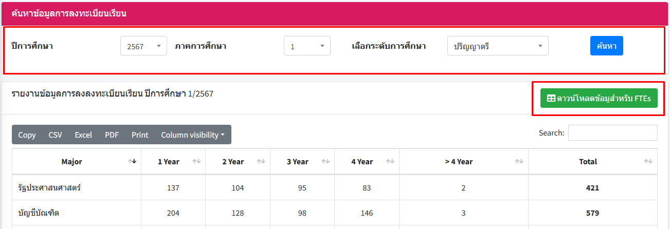 - กดปุ่ม ดาวน์โหลดข้อมูลนักศึกษาลงทะเบียนสำหรับ FTEs หากต้องการข้อมูลรายละเอียดการลงทะเบียนเรียนของนักศึกษารายบุคคล ทุกระดับการศึกษา (เฉพาะสิทธิ์ระดับ Super Admin/Admin)