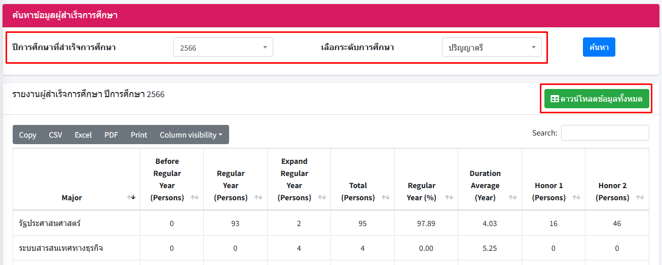 รายงานผู้สำเร็จการศึกษา สำหรับแสดงข้อมูลจำนวนผู้สำเร็จการศึกษาแต่ละหลักสูตร จำแนกตามชั้นปี เกียรตินิยม และข้อมูลระยะเวลาการศึกษา
