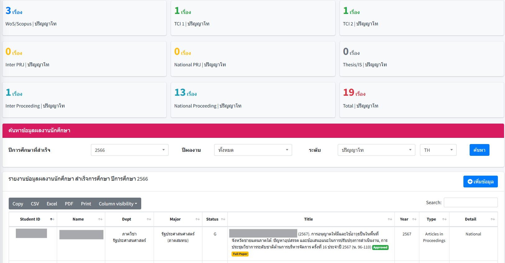 - กดปุ่ม ค้นหา โดยระบบจะแสดงข้อมูลในรูปแบบตาราง ตามเงื่อนไขการค้นหาข้อมูลที่กำหนด สำหรับแดชบอร์ด จะแสดงข้อมูลผลงานทางวิชาการที่ผ่านการตรวจสอบแล้ว และได้รับการตีพิมพ์เผยแพร่ฉบับสมบูรณ์ (Full Paper) เท่านั้น