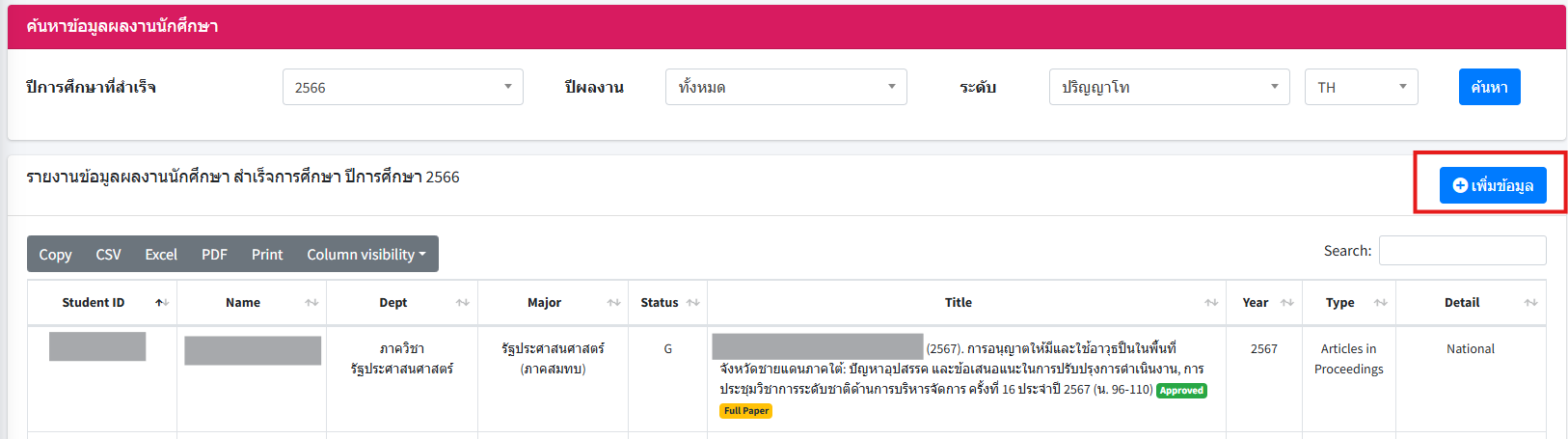 • การเพิ่มข้อมูลผลงานวิชาการนักศึกษา